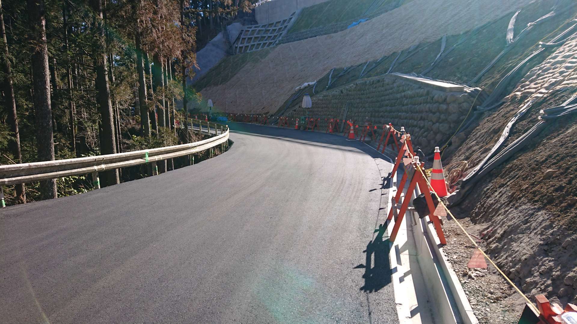 施工もきれいに仕上がり、幅員もかなり広がりました。今までは常時警備員を配置しての片側交互通行でしたが、これで普通にすれ違い出来るようになりました。