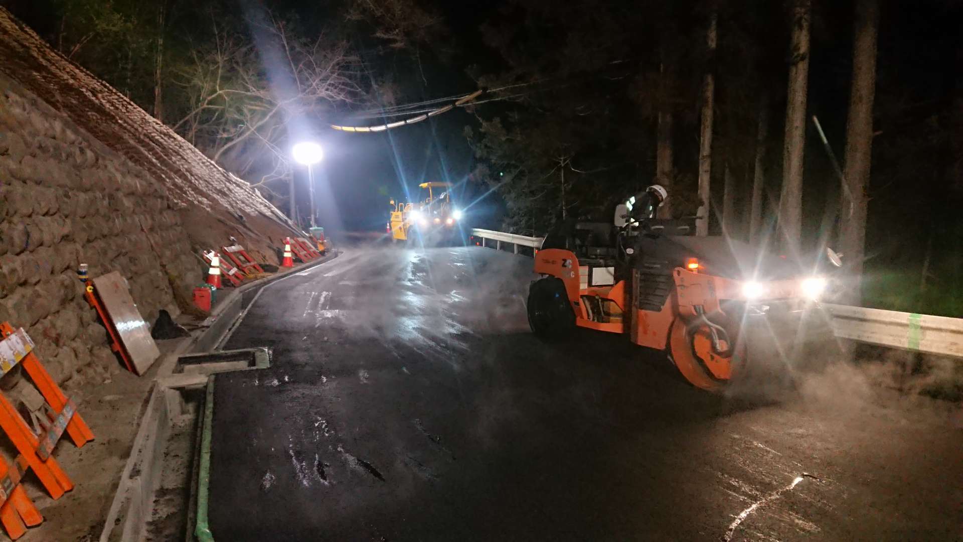 今週の3日間は夜間で舗装を施工しました。最終日は小雪舞う中ご苦労様でした。