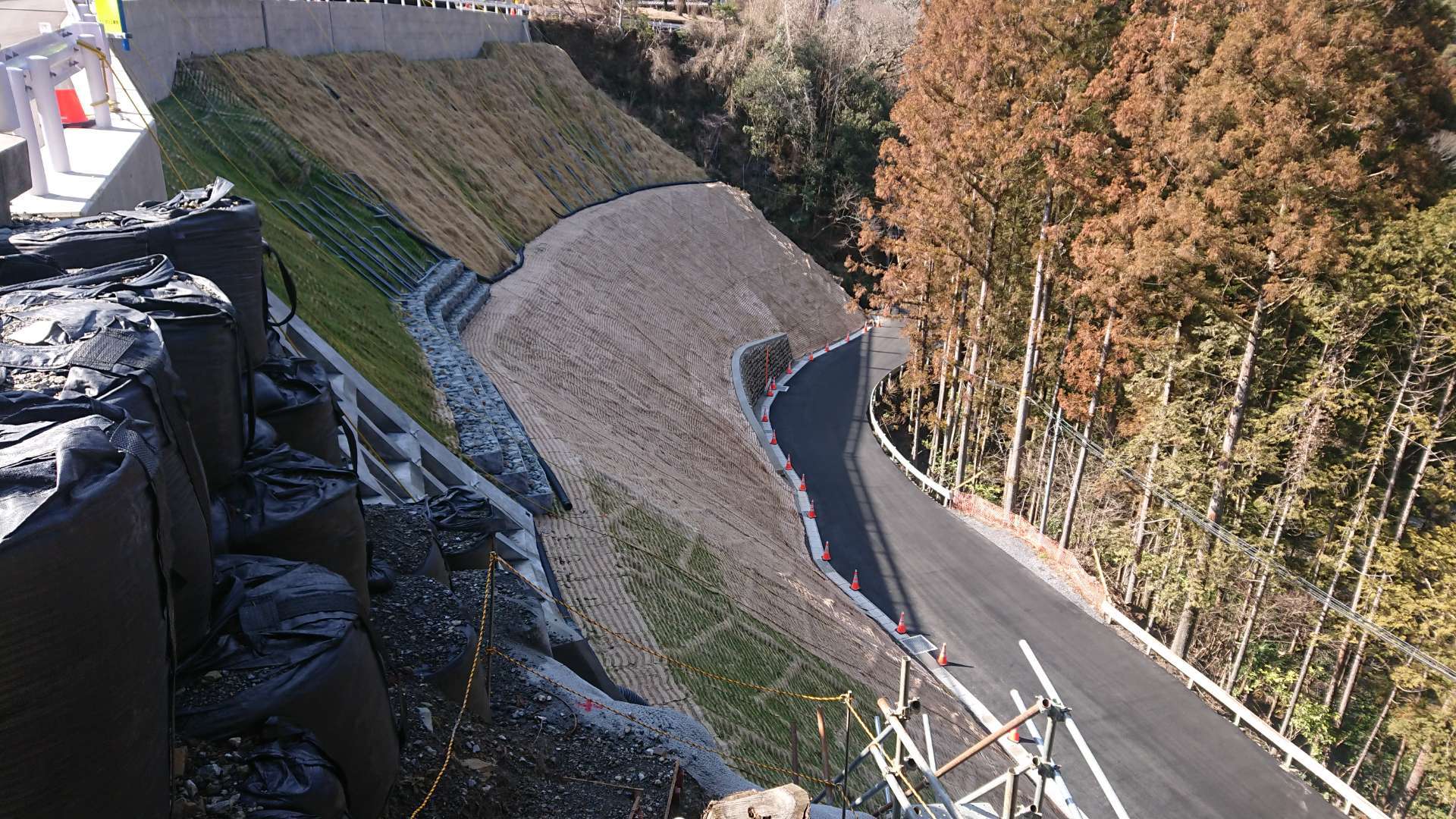 市道 静岡側より この寒さでも植生マットの発芽が枯れずに青々しています。