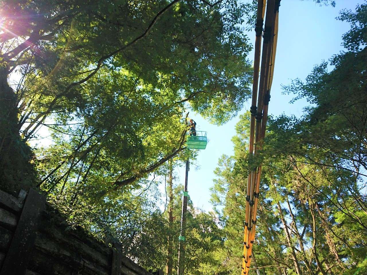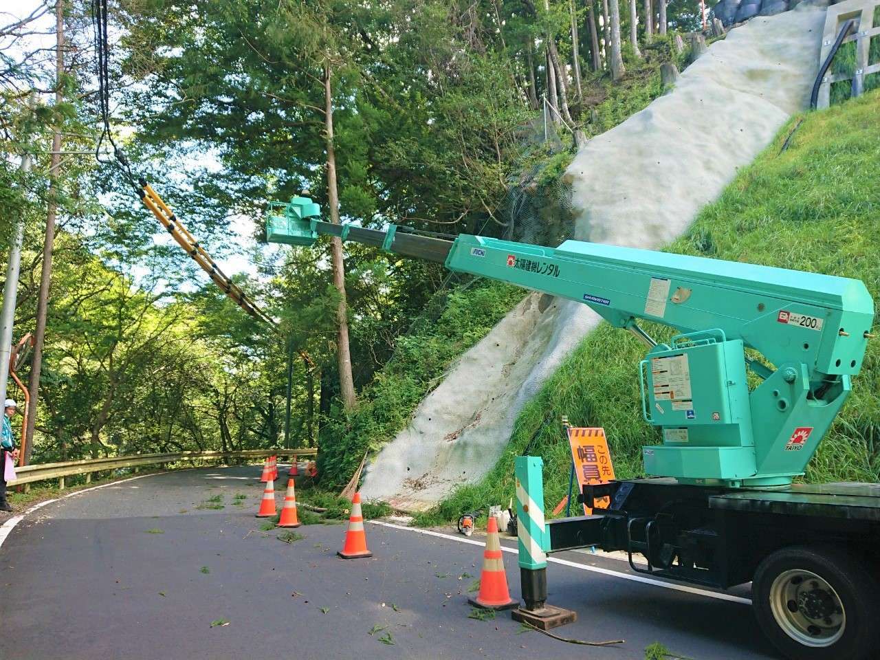 今年は例年に比べ、雨が多いですね。ゲリラ豪雨のような雨がとても多く感じられます。台風も変な進路を通りますね。朝方も雷と豪雨が凄かったです。チョット、崩れてました。今週から伐採工に着手しました。仮設防護柵を設置すると幅員が狭く高所作業車を設置できなくなるので、先に道路を覆っている雑木を伐採します。工事の中で一番手間と神経を使う伐採ですが、金額は一番少なく微々たるもんです。