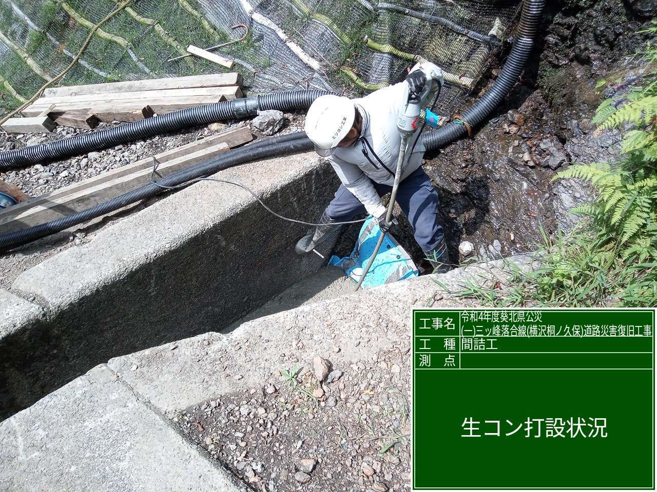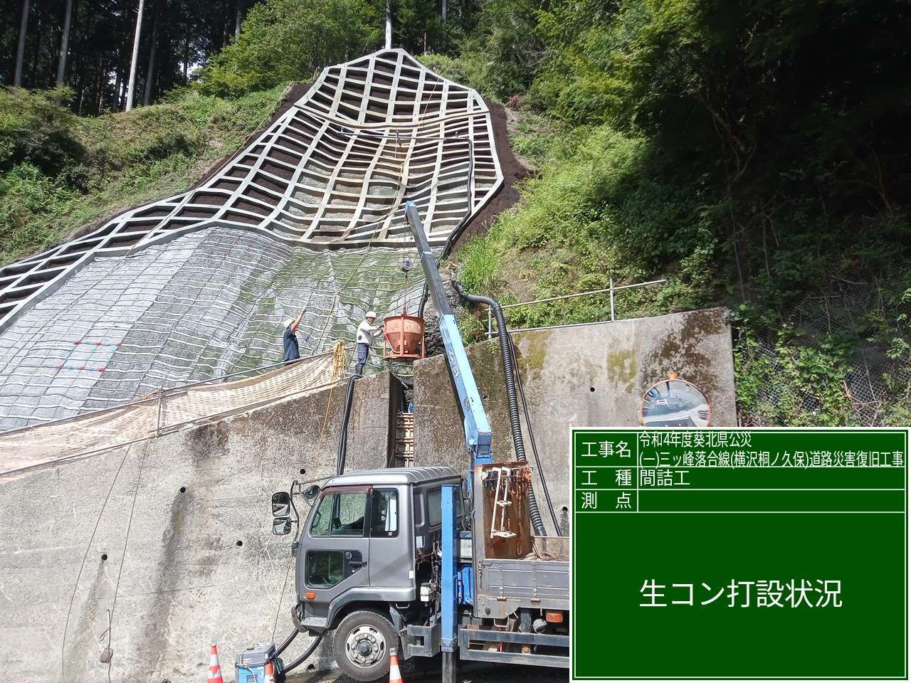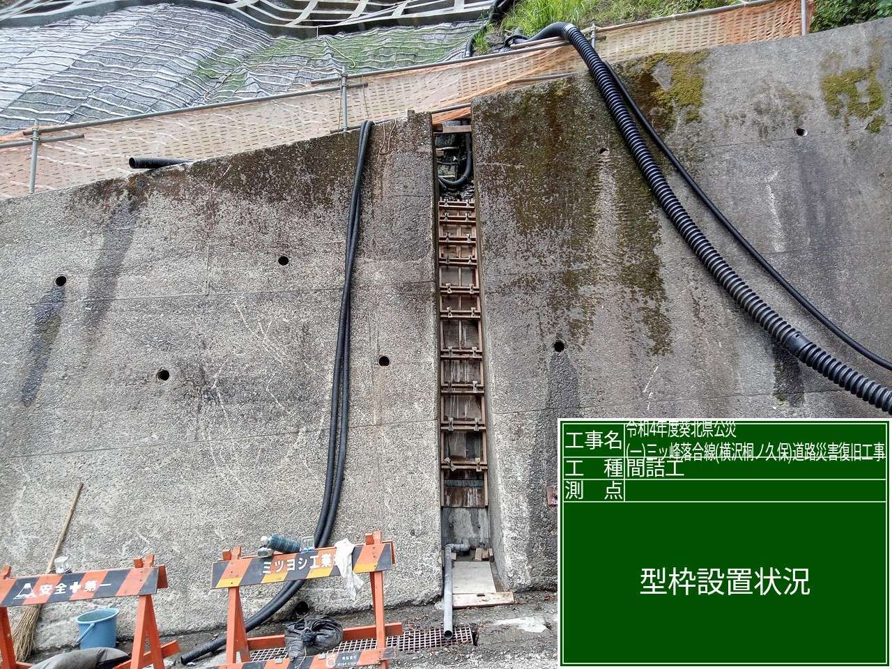 4月初旬より着手しました横沢法面工事も本日間詰工の打設が完了し、残すところ落石防護柵と舗装工だけとなりました。盆前までには完成したかったのですが、通行規制の関係で舗装を盆明けに1日施工して完成の予定です。