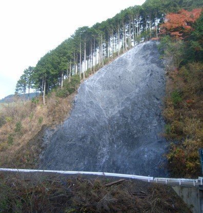 植生基材を法面に散布し、植物を増やす工法です。比較的肥沃な環境や浸食が少ない切土の法面などに効果的で、コストも抑えられます。